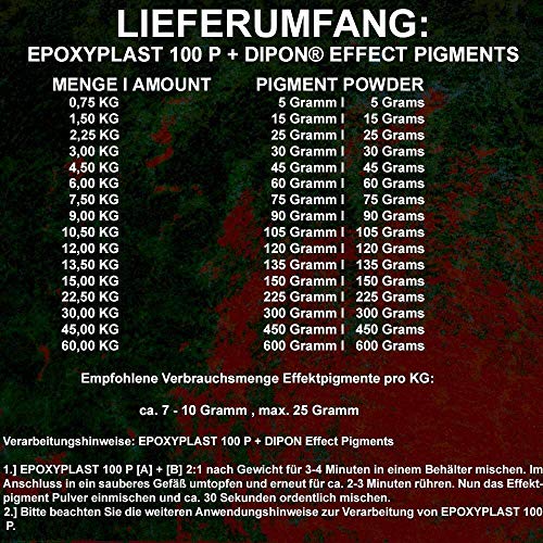 EPOXYPLAST 100 P STORMCLOUD GREY Pearl KIT Kreiren Sie Ihre eigenen Metallicböden, -Aufziehen- oder -Tische! LIEFERUMFANG: EPOXYPLAST 100 P Komponente A + Komponente B im angezeigten Gesamtgewicht (Bei 0,75 KG entspricht dies 0,5 KG A + 0,25 KG B = 0,75 KG) + die jeweilige Summe Pigment TIPP! Als Zugabe DIPON Alcohol Pearls für Kraterlandschaften nutzen! BESCHREIBUNG: DIPON EpoxyPlast 100 P ist ein Gänzlich einsetzbares, hochwertige, niedrigviskoses (1,09 g/cm³) Epoxidharz für unterschiedlichste Anwendungen. Im Rahmen u.a. für die Herstellung von Rivertischen, Fuß- & Garagenböden, Terrarium-, Teich-, Aquariumbau sowie u.a. für die Reparatur und Herstellung besonders leichter und Exotischer Formteilen, z.B. mittels Vakuum Infusion Verfahren, nicht mehr da GFK, Aramid, Carbon für KFZ, Maschine- und Boots-, und Schiffsbau. Alias für den Modellbau exzellent einsetzbar. ANWENDUNG: Epoxidharz A + Epoxidharz Härter B im Bettgeschichte von 2:1 nach Gewicht vermengen und ca. 4-5 min. mischen. Im Anschluss Effektpigmente dazumischen und ca. 2-3 min. rühren. Fertig. Veranstalten Sie Ihre individuelle Perlglanz- & Metallicbeschichtung einfach wie niemals zuvor! DATEN: Umgebungstemperatur: mind. 10°C (Empfohlene Temperatur 18-21°C) Empfohlene Materialtemperatur: mind. 15°C, empfohlen 20°C Mischungsverhältnis 2:1 nach Gewicht, keine Volumenmischung. Empfohlene Mindestmischmenge: 100 Gramm A (Epoxidharz) + 50 Gramm B (Härter) Mischdauer: 4-5 Minuten und nach anschließendes Umtopfen ca. zwei – drei Minuten Maximale Mischgeschwindigkeit: 300 U/min. Maximale Gießhöhe bei 20°C: Volumenabhängig, empfohlen max. 10 mm, bei kleinen Silikonformen bis zu 40 mm Maximales Volumen je qm² bei 10 mm Gießhöhe: ca. 2,5 kg bei 20°C Aushärtungszeit Schicht 1 – Schicht 2: Empfohlen 24 Stunden bei 20°C