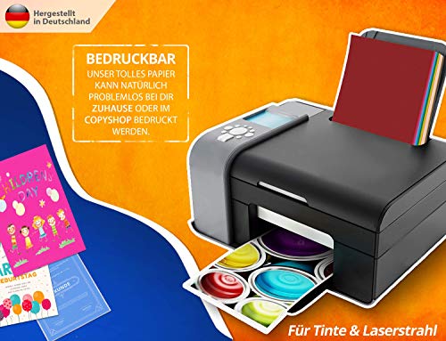 ZU HAUSE BEDRUCKBAR: Unser Papier ist nicht mehr da einfach in deinem Drucker bedruckbar. Sowohl bei einem Tintenstrahl, als alias bei dem Laserdrucker gibt es ein sehr schönes Druckbild. Bitte dafür die Papierart „KARTON“ im Drucker detachieren. Sollte dir dieses Papier zu feist sein, findest du unter der Artikelnummer „EVBPTZPA4B100“ unsere 130 g/m starke Anpassung.