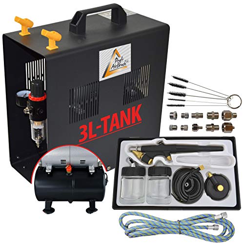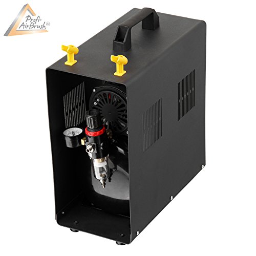 Dieser öl- und wartungsfreie Airbrush Turbolader Duo-Power II-C mit Schutzgehäuse ist für Buckeln mit allen handelsüblichen Airbrush Farben geeignet und somit ideal z.B. im kosmetischen Fetzen für Beauty Anwendungen, Tanning, Nageldesign, kleine Sprüharbeiten usw.. Mit dagegen 49dB ermöglicht er angenehmes Buckeln auch in kleineren, geschlossenen Räumen. Sein kompaktes Design und der integrierte Tragegriff lindern den mobilen Einsatz. Die Abschaltautomatik ermöglicht einen stromsparenden Betrieb. Durch den integrierten Lufttank von 3,5 Litern ist ein perfektes Buckeln durch gleichbleibenden Luftdruck möglich. Der 2. Turbolader ist manuell zuschaltbar, wenn mehr Leistung benötigt wird.