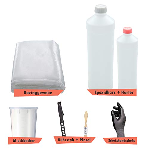 Lieferumfang: Epoxidharz, Härter, Mischbecher via Deckel, hochwertigen Arbeitshandschuhe, 300g/qm Rovinggewebe, Rührstab und Pinsel