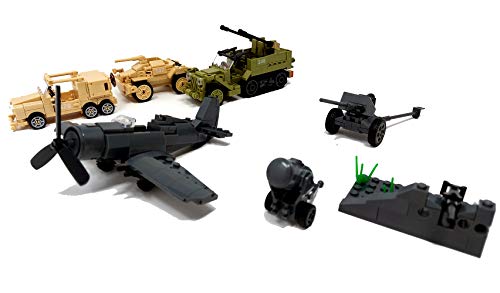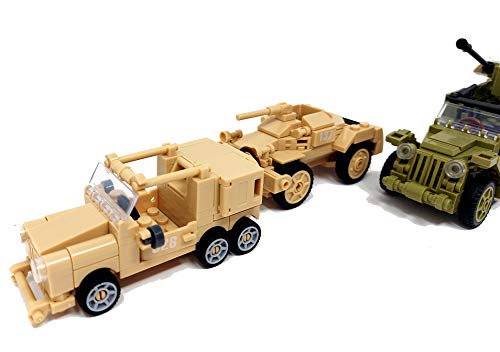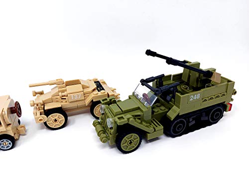 Dasjenige Klemmbausteine Set besteht sämtliche einem Panzerspähwagen Sd.KFZ 234, einem NSU Geiß, Halkbkettenfahrzeug unter Zuhilfenahme von FLAK, eine PAK, MG Nest, Sandsäcke sowie Soldaten Minifiguren unter Zuhilfenahme von Panzerung