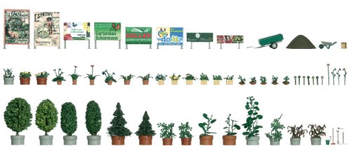 Dieser Busch-Bausatz beinhaltet mehr qua 40 Pflanzkübel, Blumentöpfe und Schalen sowie Parkbäume, Autoanhänger, Schubkarren, Werkzeuge, Werbeplakate uvm
