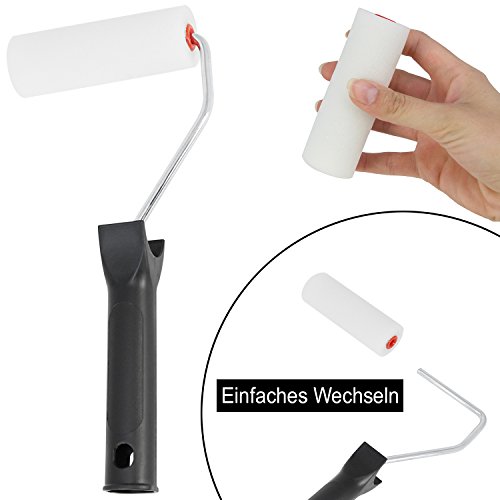 LIEFERUMFANG: 1x Griff, 1x Abtropf-Schale, 11x Schaumstoff-Rollen // Maße Griff: 23 cm lang // Maße je Schaumstoff-Rolle: 10 cm x Ø 3,3 cm // Maße Auffangschale: 27,5 x 14 x 3,5 cm // Material: Kunststoff, Metall, Polyester