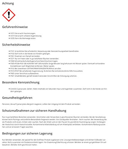 EINFACHE ANWENDUNG – Leichter Kontaktdruck und eine relative Luftfeuchtigkeit von 65% bieten beste Voraussetzung für eine einfache Anwendung. Der Superkleber erreicht nach spätestens 24h maximale Endfestigkeit.