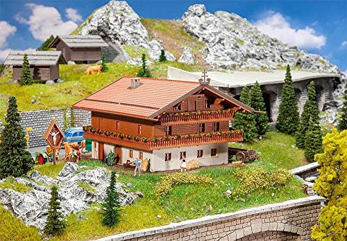 2-stöckiges Wohnhaus im alpenländischen Baukunst via einem verputzten Erdgeschoss sowie einem ganz Holm gezimmerten Obergeschoss außerdem einem großen Galerie. Ein Wegkreuz liegt dem Bausatz zur Dekoration benachbart.