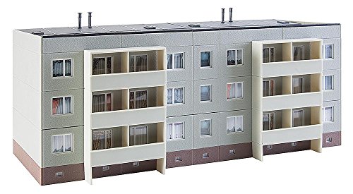 Die gute, alte Platte. Modulares Modell des in der DDR bis Abschluss der 60er Jahre am häufigsten gebauten Plattenbautypus. Das P in der Bezeichnung steht für parallel, da obendrein die tragenden Wände parallel zu den Fassadenwänden angeordnet sind. Die 2 steht für die Anzahl der Aufgänge. Zum Umfang der Basispackung gehören der um ein halbes Geschoss herausragende Sockel mit Eingängen, 3 Stockwerke mit Balkonen auf der rückwärtigen Seite sowie Drempel und Flachdach. Das Model kann modifiziert vulgo als Relief im Anlagenhintergrund verwendet werden. Bitte ästimieren Sie: jeweils zwei ergänzende Stockwerke, um das Modell bis zu einer Geschosshöhe mit den üblichen 5-11 Stockwerken zu erweitern, enthält der Aufsatz Plattenbau P2 Anhang (Art. 130802). Ausdehnung: 305 x 155 x 125 mm, Epoche III.