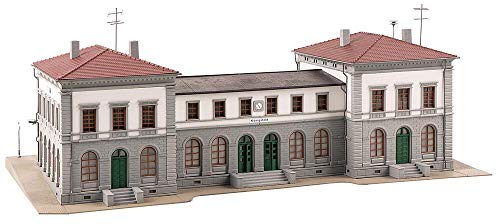 Spurweite: H0, Maßstab: 1/87, Weltalter I, Artikelgruppe: Bahnhöfe Detaillierter Modellbausatz von FALLER! Limitiertes Modell eines dreiflügeligen Empfangsgebäudes. Mittelteil ebenso Eckbauten des spätklassizistischen Sandsteinbaus schulen einen H-förmigen Grundriss. Zur Ausrüstung gehört eine Glasüberdachung des Bahnsteigs. Maße: 500 x 280 x 190 mm Wir nahe legen unseren Kleber 170490/170492 sowie Vallejo-Farben.