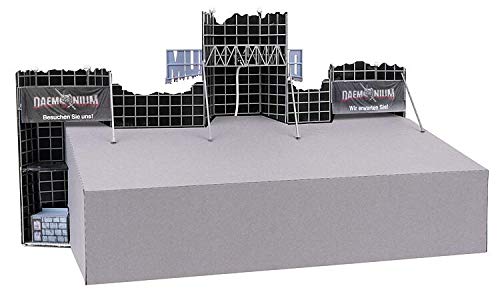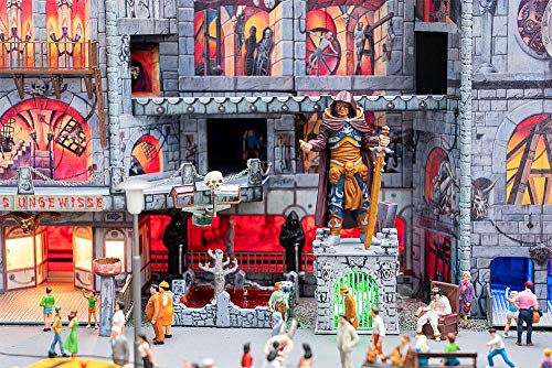 Gruselspektakel im XXL-Format. Digital bedrucktes Funktionsmodell einer großen, mobilen 3-Fahrebenen-Geisterbahn nach dem Originalvorbild »Daemonium« des Schaustellers Martin Blume, einem Fahrgeschäft-Bau des Unternehmens »Mack«. Die eingleisige Expedition führt in käfigähnlichen Gondeln angesichts eine bizarre Folterkammer der Inquisitionszeit. Die Dekorationsmalerei der burgartigen Fassade (»Fasson Künstlerwerkstatt Bernhardt«), der bewegte Schriftzug auch die fantasievoll gestalteten Figuren im Außenbereich realisieren aufwendige Gruselszenarien. 4 Motoren enthalten. Gondeln keineswegs drehbar.