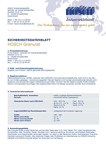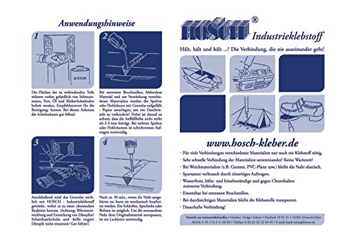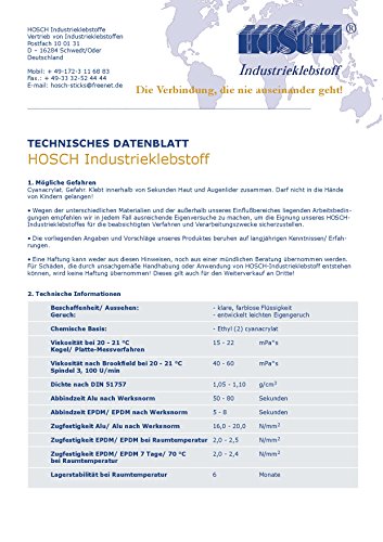 Die chemische Schweißnaht- weit mehr als dagegen Kleber Bei durchsichtigen Materialien bleibt die Klebestelle transparent. Dauerhafte Verbindung! HOSCH-Industrieklebstoff beruht auf der Basis von Cyanacrylatklebstoff. Der Grundstoff ist Cyanacrylsaureethylester. Es ist ein hochwertiges Produkt, das eine Enorm hohe Reinheit aufweist. Bei der Herstellung von HOSCH-Industrieklebstoff werden keine Lösungsmittel verwendet. Es werden Enorm gute Verbindungen in den Bereichen des Handwerks, der Auto-, Freizeit-, Spiel- und Modellbauindustrie so- wie bekannt als im Haushalt (z. B. Gummi, Holz, Kunststoff, Porzellan u.a.) erzielt. Bei diesen Verbindungen ist es wichtig, dass diese warme- und kaltebestandig und gegen Chemikalien , Ol usw. resistent sind. Bei durchsichtigen Materialien bleibt die Verbindung transparent (Autospiegel, Plexiglas…) Bei Verbindung von Kunststoffen wie z.B. Polyethylen (PE), Polypropylen (PP) und anderen klebstoffabweisenden Materialien ist es notwendig, diese vorher mit einem Primer zu ausarbeiten, da es sonst nicht zu der gewuenschten Festigkeit kommt. ***Cyanacrylat. Klebt innerhalb von Sekunden zusammen. ! ! ! ACHTUNG: Wärmeentwicklung und Enstehung von Abmildern! Abschirmung-Handschuhe und -Brille unterstützen! Dämpfe nicht einatmen! Gut lüften! Anwendungshinweise verbannen! Darf nicht in die Hände von Kindern gelangen! Nicht einnehmen!