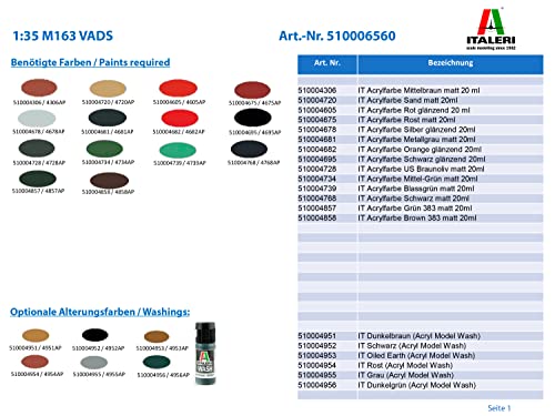 Art.Nr.: 510006560 Artikelbezeichnung: 1:35 M163 VADS Detaillierter Plastikmodellbausatz des Modells M163 VADS im Maßstab 1:35 Modellbausätze und Fertigmodelle von ITALERI, dem italienischen Traditionshersteller sondern feine Miniaturen, begeistern seit anhand 50 Jahren weltweit Modellbauer. Sie haben sich im Laufe der Jahre einen guten Ruf und eine riesige Fangemeinde geschaffen. ITALERI produziert seit 1962 Bausätze und Fertigmodelle in höchster Form und Passgenauigkeit, dies in den Maßstäben 1:16 bis 1:720. ITALERI-Werkzeug, -Farben und weiteres -Zubehör werden markenübergreifend verwendet und bespaßen sich größter Beliebtheit. ITALERI-Bausätze können nach eigenen Vorstellungen lackiert werden. Zur Fertigstellung werden verriegelt erhältliche Farben, Leim und Kleinwerkzeug benötigt. Die Einsteigerserien MY FIRST MODEL KIT und MODEL SET enthalten bereits Farben und teils sogar Werkzeug.
