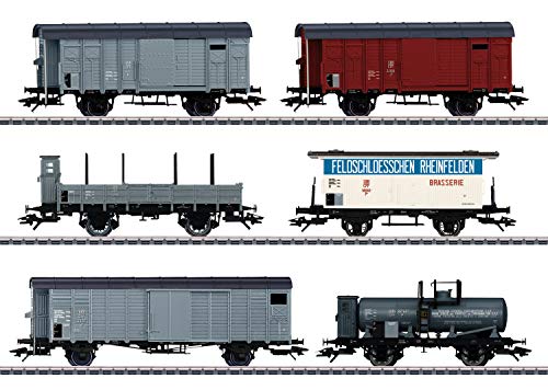 Güterwagen-Set zum „Köfferli“. Anflug H0. Epoche II. Modell: Gedeckte Güterwagen K3 bzw. J2d und gedeckter Güterwagen J3 mit Schiebetüren zum Öffnen. Zugunsten den Niederbordwagen liegen Rungen zum Anstecken daneben. Bierwagen mit beidseitigen Bremserbühnen. Jedweder Wagen getrennt eingepackt. Alternative Umverpackung. Gesamtlänge über Puffer 69,5 cm. Gleichstromradsatz E700580, E700630, E32301211.