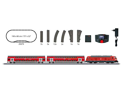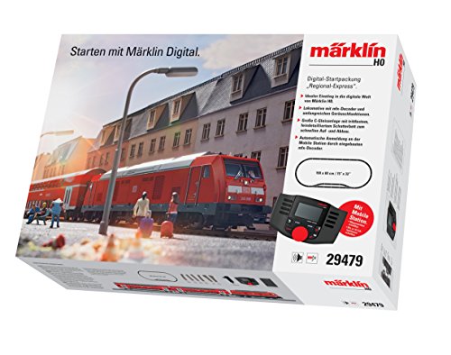 Märklin Digital-Startpackung „Regional-Express“. 230 Volt. Spur H0. Vorbild des Startersets: Dieselelektrische Lokomotive Baureihe 245 und 2 Doppelstock-Nahverkehrswagen der Deutschen Bahn AG (DB AG). 1 Doppelstockwagen 1./2. Klasse DABza 756 und 1 Doppelstockwagen 2. Klasse DBza 751. Modell: Lokomotive in Metallausführung, mit Digital-Decoder mfx und schaltbaren Geräuschfunktionen. 4 Achsen über Kardan angetrieben. Haftreifen. Fahrtrichtungsabhängig wechselndes Dreilicht-Spitzensignal und 2 rote Schlusslichter, althergebracht lebendig, digital schaltbar. Beleuchtung mit warmweißen und roten Leuchtdioden (LED). Wagen mit getönten Seitenfenstern. Länge des Zuges 75, 3 cm. Inhalt: 12 gebogene Gleise 24130, 5 nunmehrig Gleise 24188, 7 nunmehrig Gleise 24172, 2 gebogene Gleise 24224 und 1 Paar Weichen 24611 und 24612. Gleisanschlussbox, Schaltnetzteil 36 VA/230 V und Mobile Station. Illustriertes Spielbuch mit vielen Tipps und Anregungen. Erweiterungsmöglichkeiten mit den C-Gleis-Ergänzungspackungen und mit dem gesamten C-Gleis-Programm. Highlights: Idealer Einstieg in die digitale Welt von Märklin H0. Automatische Anmeldung an der Mobile Station durch eingebauten mfx-Decoder. Aufbaufreundliche C-Gleis-Appendix.