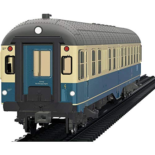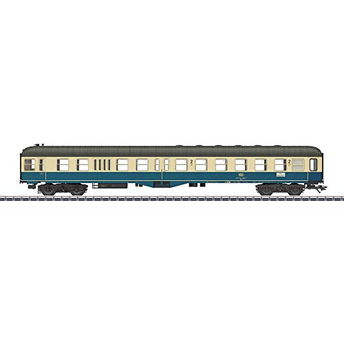 Prototype: 2nd class control car of the German Federal Railways (DB) for so-called light express trains (LS). Type BDylf 457 with luggage compartment without side passage. Colloquially somit known as „Mitteleinstiegswagen“. Variante with small tail lights at the top and one-piece windows at the entrances at the end of the car. Coloring in ocean blue / ivory. Home station Hagen Hbf. Operating condition 1984. The most important data Item No. 43335 Track / type H0 / 1:87 epoch IV kind Passenger cars Highlights Complete redesign. With digital decoder mfx. Top lighting digitally switchable. Standard with LED interior lighting, digitally switchable. Driver’s cab lighting, digitally switchable. Separable, current-carrying couplings, digitally switchable. Interior lighting of the entire wagon association durch decoder in the control car digitally switchable. Exemplary train run: Hagen – Bruges (Westf.) product Model: With digital decoder mfx. Depending on the direction of travel, the three-light peak signal and two red taillights are conventionally switched on, digitally switchable. Standard built-in LED interior lighting digitally switchable. Driver’s cab lighting digitally switchable. Current-carrying coupling digitally switchable. Type-specific designed underbody. Front side red transparent tail light inserts at the end of the car without driver’s cab. Bogies type Minden-Deutz mühsam with double block brake. Front bogie with track cleaner, Sifa control box, Indusi and generator D 62. Minimum radius 360 mm. For the presentation in a showcase, a WC downpipe and a Wendezugsteuerleitung are attached as separately attachable parts. Length over buffer 28.2 cm. product Info The matching cars can be found in the Märklin H0 assortment under item numbers 43125 and 43165. A suitable diesel locomotive can be found in the Märklin H0 assortment under item number 39212. This model can be found in a DC version in the Trix H0 as