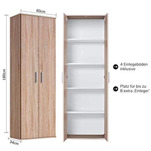 Wissenswertes: Maße & Gewicht 60cm/180cm/34cm (B/H/T) & 34,5-38kg, DIN Belastbarkeit je Einlegeboden 8kg (Freigabegewicht). Einfache Montage notwendig. Belieferung über Paketversand – 100% klimaneutral. Einzelnes Produkt wird in 2 Paketen geliefert.