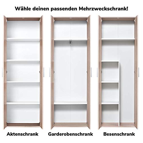 Stell dir deine Schrankwand zusammen! Wähle alle den drei Varianten Aktenschrank (mit 4 Einlegeböden), Kleider- bzw. Garderobenschrank (mit ausziehbarer Kleiderstange & 2 Einlegeböden) oder Putz- bzw- Besenschrank (mit Staubsaugerfach und 4 kleineren Fächern) – Vielseitiger Stauraum für Arbeitszimmer, Schlaf- & Gästezimmer, Bad oder deinen Flur & Kabuff garantiert!