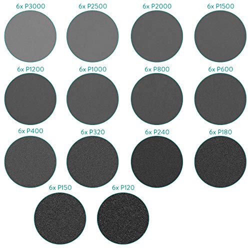 LIEFERUMFANG: Sie erhalten 84 rechteckige Schleifblätter (93x230mm) in versch. Körnungen von hartgesotten bis fein. Das Set ist aus folgenden Körnungen zusammengesetzt: je 6x P120, 150, 180, 240, 320, 400, 600, 800, 1000, 1200, 1500, 2000, 2500, 3000