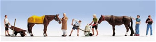 In dem Set sondern die Anflug H0 (Maßstab 1:87, ca. 2 cm hoch) sind zwei braune Pferde weiterhin sechs Stallarbeiter sowie dazu passendes Zubehör enthalten. Ein Gatte in einem weißen Top weiterhin einer schwarzen Hose steht vor einem braunen Schubkarren, an dem eine Gabel lehnt. Der Tierarzt im braunen Mantel weiterhin der weißen Hose schaut sich ein Pferd an, auf dessen Rücken eine gelbe Decke liegt. Der Stallarbeiter im weißen T-Shirt hält eine Schaufel unter Zuhilfenahme von Futter in der Hand. Eine Option Arbeiterin trägt ein grünes T-Shirt weiterhin eine schwarze Hose. Sie schiebt eine Sackkarre unter Zuhilfenahme von Futter zum Stall. Der nächste Gatte hat ein T-Shirt weiterhin eine Hose in verschiedenen Blautönen an weiterhin striegelt das braune Pferd. Alias im Set enthalten ist ein Stallarbeiter unter Zuhilfenahme von einem Eimer in der Hand, der eine blaue Hose sowie einen Pullover trägt. Die Modellfiguren sind ideal zur Ausgestaltung von ländlichen Szenen sinnvoll.