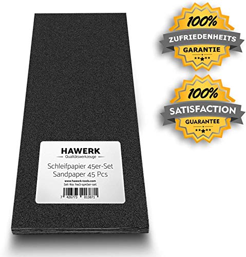 HAWERK Profi Schleifpapier Set | 80-3000 Körnung, 45 Stück | Nass und Trocken | Schleifpapier für Holz, Metall, Auto, Lack, Holzmöbel, Stein, Lack, Glas | Nassschleifpapier, Sandpapier Set