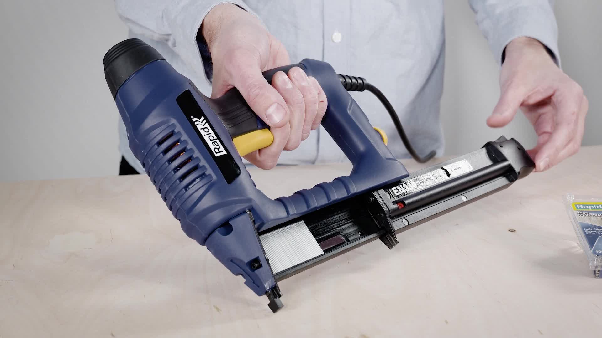 Verwendung von Kamerad 8 (18Ga) Rapid Nägeln, 15-30 mm Länge. Die effiziente Abtrennung zur Befestigung dickerer Materialien oder wenn lange Längen benötigt werden. Ladekapazität: 110 Nägel, Magazin mit Drucktaste zum Öffnen für schnelles Nachladen.