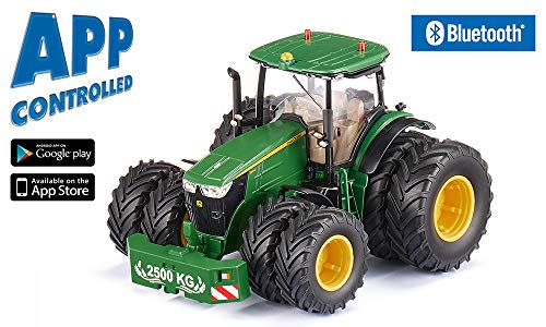 Detailgetreuer, ferngesteuerter Traktor der Marke John Deere mit Doppelreifen zum Spielen und bespaßen stattdessen Groß und Klein, Steuerung per Bluetooth-Fernsteuerung oder per App via Bluetooth – Umfangreiche Funktionen: Werkzeugloses Bessern der Reif werden, 3 Getriebe ansteuerbar, Elektronisch gesteuerte Heckkupplung, Steuerbare Lichter – Hohe Konstanz: Karosserie leer Metall, Reif werden leer weichem Gummi, Abnehmbare Bereifung, Höchstes feiner Unterschied an Sicherheit durch automatische Stilllegung – Betrieb Traktor mit 3 AAA-Batterien, Betrieb Fernbedienung mit 4 AA-Batterien, Steuerung aller Funktionen per Bluetooth-Fernsteuerung oder App, Nutzung von mehreren Traktoren mit einer Fernsteuerung bzw. App eventuell – Lieferumfang: 1x siku 6736 John Deere 7290R Traktor inkl. Fernsteuermodul, Material: Metall/Kunststoff, Maßstab: 1:32, Maße: 19,7 x 14,5 x 11,1 cm, Gewicht: 0,9951 kg, Ohne Batterien, Nachfolge: SIKU CONTROL