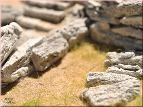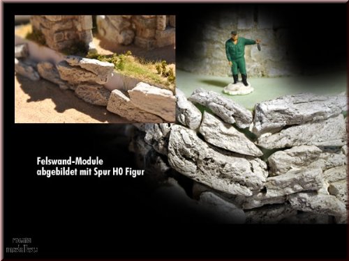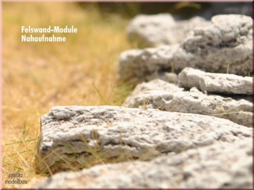 Drehen und neigen Sie die einzelnen Felswand-Module, ähnlich einem Puzzle. Als Untergrund können Sie Holz, Hartschaumstoff oder ähnliches verwenden. Am besten: Abhalten Sie zunächst auf den vorgesehenen Untergrund mit Gips eine grobe Felsstruktur. Fügen Sie dann die einzelnen Module nach Wunsch ein. Verwenden Sie wenn möglich für den Untergrund einen Modellbaugips damit Sie nach Maß reichhaltig Zeit haben. Ich selbst arbeite meist so, dass ich den Untergrund mit Gips gestalte und diesen etwas aushärten lasse. Dann verwende ich den lufttrocknenden Ton den ich darauf aufknete und darin die einzelnen Felswand-Module mit Leim bestrichen eindrücke. Falls erforderlich könnte man auch stellenweise noch mit Gips abdichten bzw. verspachteln. Drehen Sie die einzelnen Bausteine auch nach Maß geeignet. Und: Es müssen ja nicht immer „jedoch“ Felsen sein? Begrünen Sie eine Fläche und lassen Sie jedoch stellenweise manche Felsstücke herausragen.