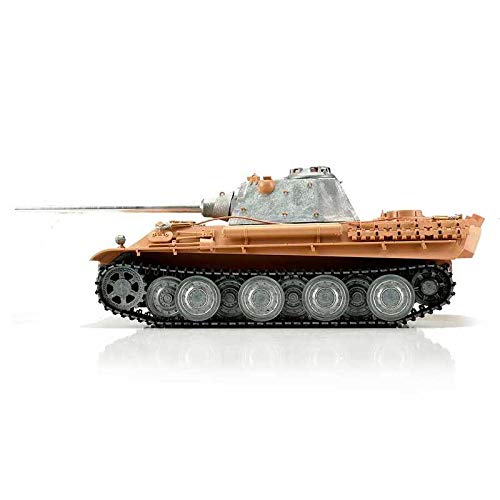 Mit den Maßen von ca. 555x205x190 (LxBxH mm) ist der Panther F ideal für den anspruchsvollen Kunden. In der Profi-Beule zeigt er sich mit 2.4 GHz Platinentechnik und neuem Lautsprecher. Dieses Modell weist überlegene Fahreigenschaften, verschiedenste Funktionen und realitätsnahen Sound auf. Die hochwertigen Ketten, Treib- und Leiträder sowie Laufrollen, wie auch die Unterwanne und der Gefechtsturm sind aus Metall gefertigt. Viele Kleinteile wie Munition und unterschiedliche Aufkleber runden die maßstabsgetreue Schablone perfekt ab.