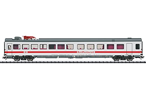 Speisewagen WRmz 137 DB AG,TRIX H0, Phase V. Speisewagen Bauart WRmz 137 der Deutschen Bahn AG (DB AG). Druckertüchtigte Vollziehung Mithilfe SIG-Übergängen sondern den Fernverkehr. Lichtgraue Fernverkehrs-Farbgebung Mithilfe verkehrsrotem Zierstreifen. Wagenlauf: IC 2013 von Dortmund nach Oberstdorf. Wagen-Ordnungsnummer 11. Betriebszustand 2003. Serienmäßig eingebaute LED-Innenbeleuchtung u. a. Strom führende Kupplungen. Die Innenbeleuchtung funktioniert im Verbund Mithilfe dem IC-Steuerwagen u. a. kann anhand einen Decoder im Steuerwagen digital ein- u. a. ausgeschaltet werden. Stirnseitig rot transparente Schlusslicht-Einsätze an den Wagenenden. Typspezifisch gestaltete Kittel. Drehgestelle Mithilfe Scheibenbremsen, Magnetschienenbremse u. a. Schlingerdämpfer. Bauliche Merkmale druckertüchtigter Wagen qua beispielsweise SIG-Übergänge, Einstiegstüren u. a. Fenster. Ein mechanisch funktionsfähiger Dachstromabnehmer. Aufgedruckte Wagenlaufschilder. Befahrbarer Mindestradius 360 mm. Länge anhand Puffer ca. 28,2 cm.