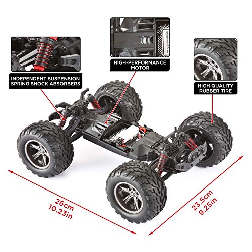HOHE GESCHWINDIGKEIT & LEISTUNGSSTARKER AKKU – Mit dem leistungsstarken Motor und den realistisch aussehenden Gummireifen beträgt die maximale Geschwindigkeit bis zu 41 km/h, bei einem Akku von Li-Ion 9.6V 800mAh. Geländewagen mit 6A Stromkreis und Temperatur Schutzmechanismus.