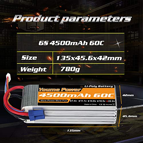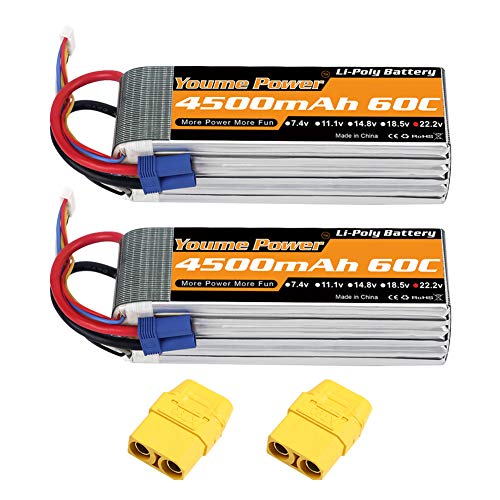 【WAS SIE ERHALTEN】2 Packungen Youme 22.2v 6s Lipo 4500mah 60c EC5 Stecker Lithium-Polymer-Akku, große Kapazität, hoher Burst, schnell aufgeladen, lange Lebensdauer (mindestens 150-fach), bis zu 200Wh / kg Energiedichte